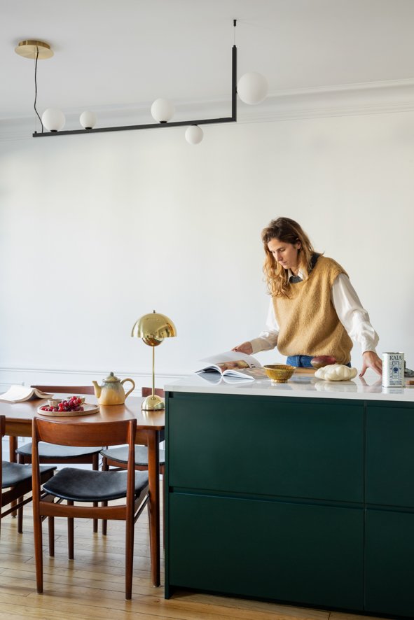 Pour le choix des couleurs, nous nous sommes inspiré d’une affiche transatlantique bleue mer et jaune soleil, visible dans la chambre principale de l’appartement. Les différentes colorimétries du projet ont donc été principalement définies sur la base de ces deux couleurs, tout en s’accordant des libertés : une cuisine vert foncé, une salle de bain vert et rose pâle ainsi qu’un bureau orange.